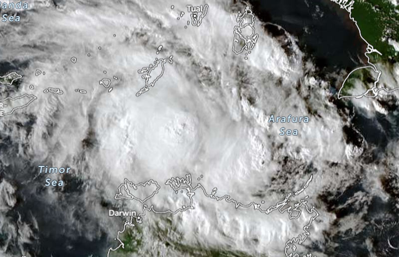 Badai tropis (Tropical Storm) Fina menguat menjadi kategori 2 di Laut Arafura, pada Rabu (19/11) siang. Sistem saat ini terletak di selatan tenggara Kepulauan Tanimbar atau selatan Tual, Maluku, dan timur laut Darwin Australia.