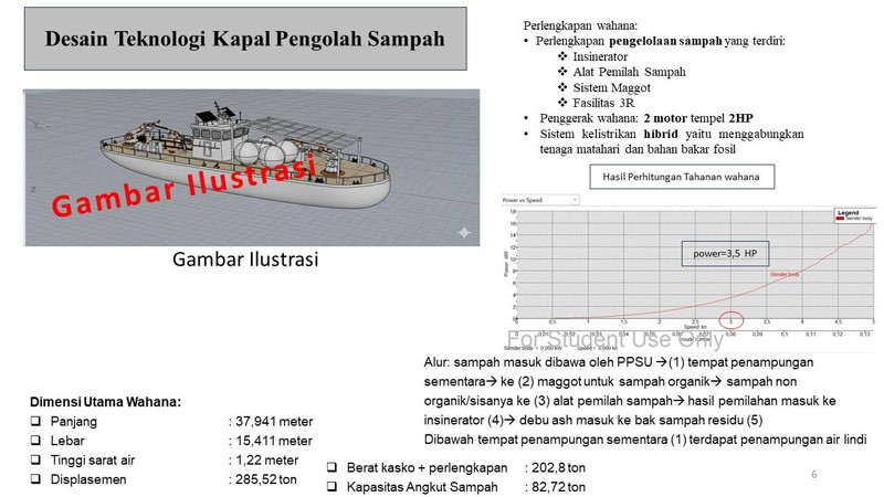 Menurut periset Pusat Riset Teknologi Hidrodinamika BRIN, Daud Saputra Amare Sianturi, pengembangan kapal pengolah sampah sebagai solusi pengelolaan sampah terpadu di kawasan pesisir dan pulau kecil.