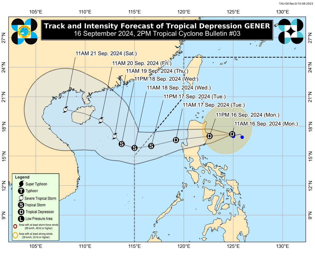 Selanjutnya, Gener akan muncul di perairan pesisir La Union atau Pangasinan pada Selasa (17/9) pagi.