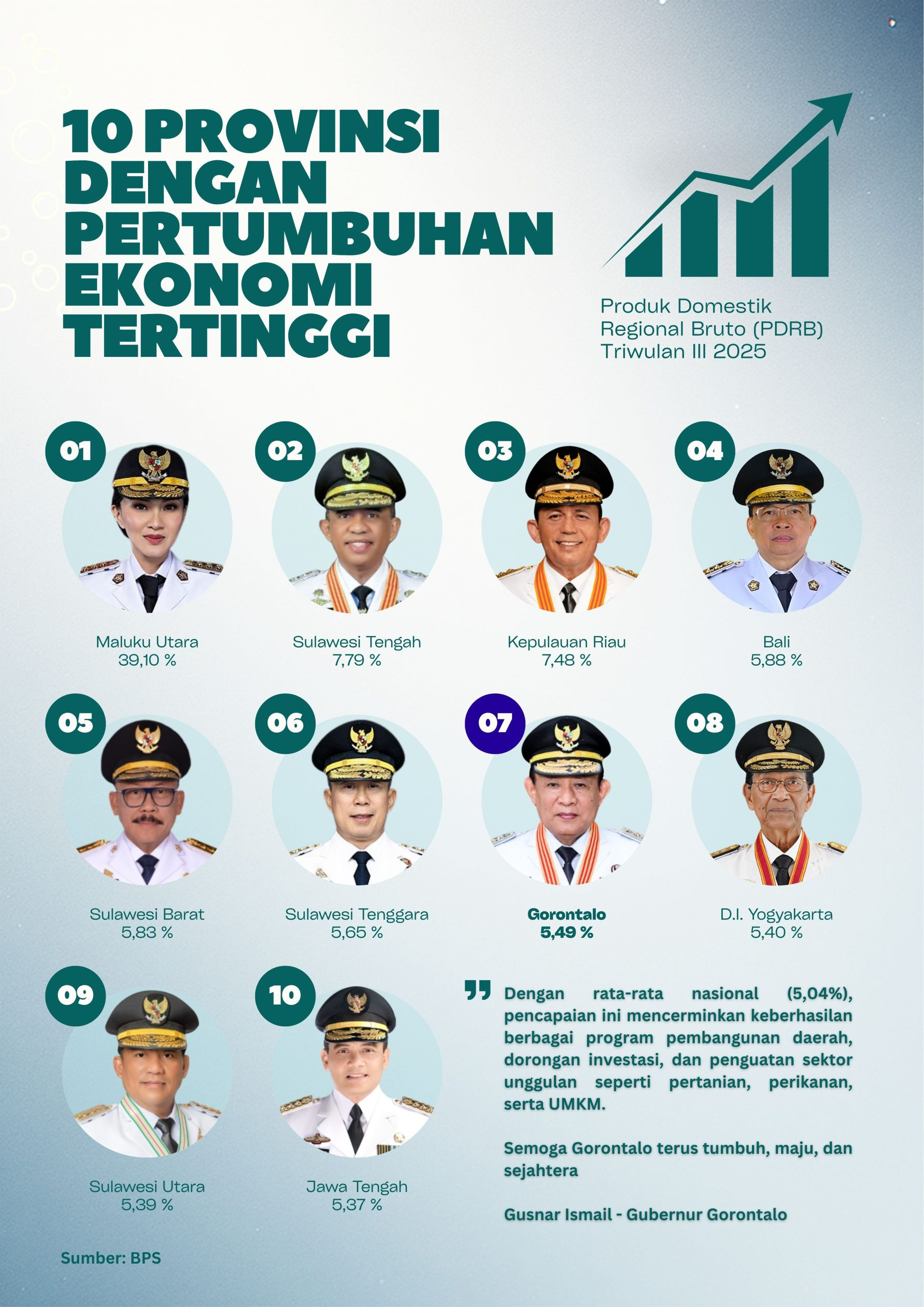 Berdasarkan data Badan Pusat Statistik (BPS) yang dilansir dari goodstats, capaian tersebut menempatkan Provinsi Gorontalo di peringkat ke-7 dalam daftar 10 provinsi dengan pertumbuhan ekonomi tertinggi secara nasional. Dalam daftar tersebut, Maluku Utara berada di posisi puncak dengan pertumbuhan mencapai 39,1 persen, disusul Sulawesi Tengah sebesar 7,79 persen, dan Kepulauan Riau sebesar 7,48 persen.