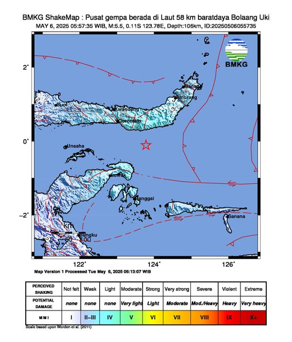 Darilaut – Gempa Magnitudo (M)5,5 menggoyang Gorontalo, pada Selasa (6/5) pagi.