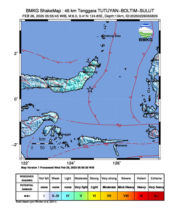 Darilaut – Gempa bumi berkekuatan magnitude (M) 6,0 mengguncang Bolaang Mongondow (Bolmong) dan Gorontalo, Rabu (26/2) pagi.