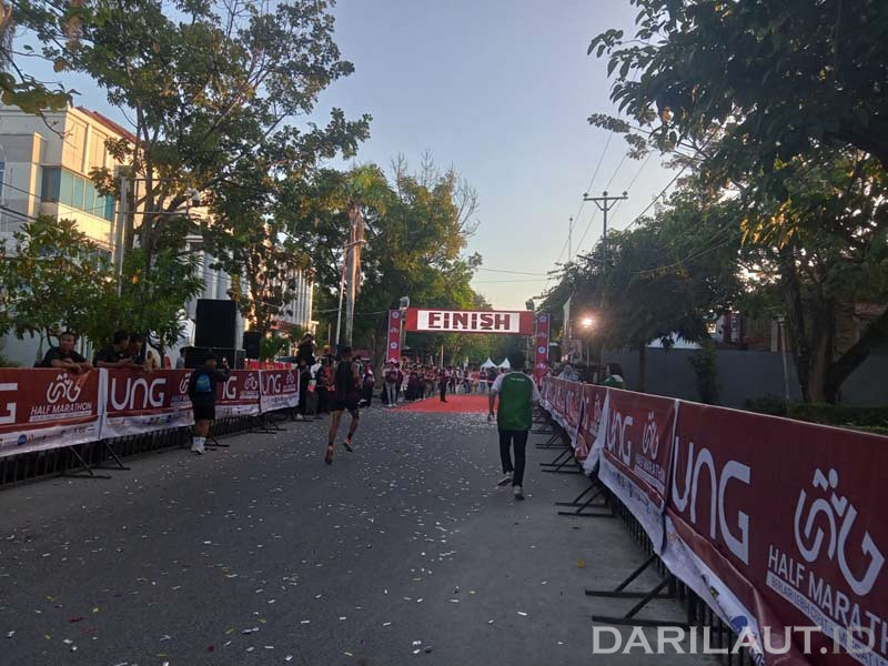 Peserta memasuki garis finis UNG Half Marathon pada Minggu 4 Mei 2025. FOTO: DARILAUT.ID