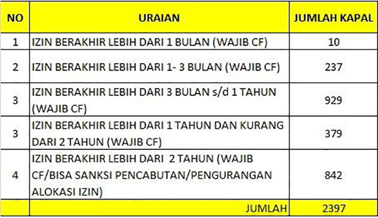 Jakarta – Izin 2.397 kapal ikan dengan gros tonase (GT) >30 sudah mengalami kadaluwarsa. Kapal ikan tersebut belum mengajukan perpanjangan izin kembali.
