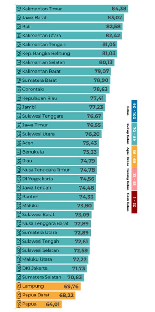 Survei IKP 2023 mencatat Kalimantan Timur dengan nilai tertinggi, yaitu 84,38. Berikutnya Jawa Barat (83,02), Bali (82,58), Kalimantan Utara (982,42), dan Kalimantan Tengah (81,05).