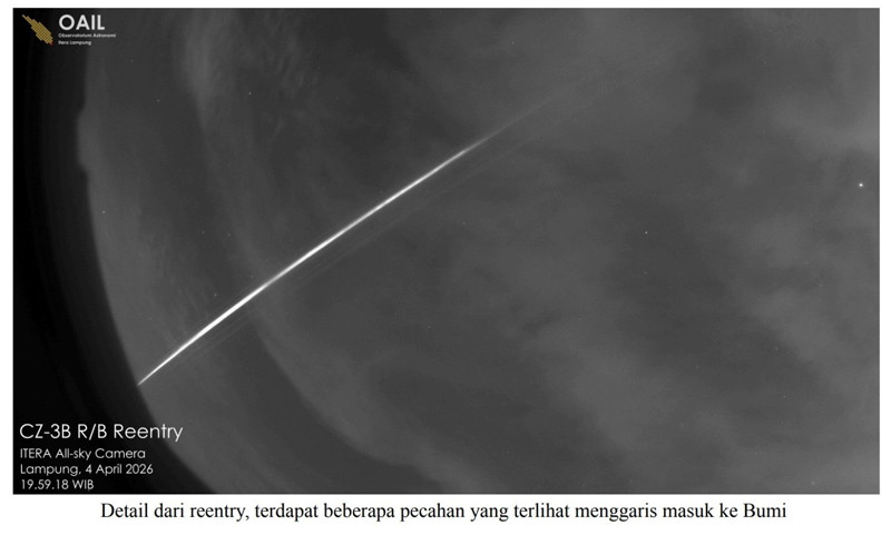 Tim Observatorium Astronomi Itera Lampung (OAIL) juga telah mengidentifikasi fenomena benda jatuh yang terlihat di langit Lampung pada Sabtu (4/4) malam. Benda tersebut sampah antariksa (space debris) berupa sisa badan roket CZ-3B R/B milik Tiongkok.