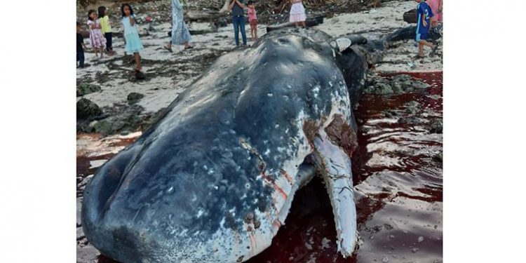SEEKOR paus sperma ditemukan mati terdampar di pantai Gusi, Buton Utara, Sulawesi Tenggara, pada Jumat (5/7). Paus sperma (sperm whale) ini berukuran 9,6 meter.