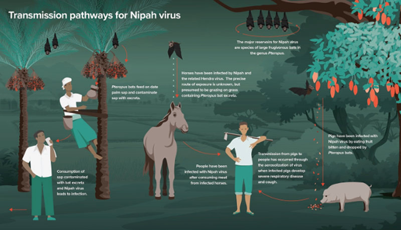 • Upaya pencegahan penularan pertama-tama harus difokuskan pada pengurangan akses kelelawar ke getah pohon kurma dan produk makanan segar lainnya.