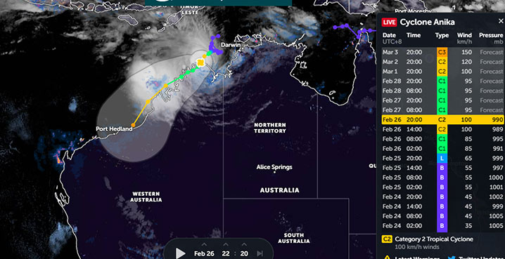 Pada tahap ini, Siklon tropis Anika melintasi pantai Kimberley sebagai siklon tropis kategori dua, kemungkinan besar di suatu tempat antara Kalumburu dan Wadeye.