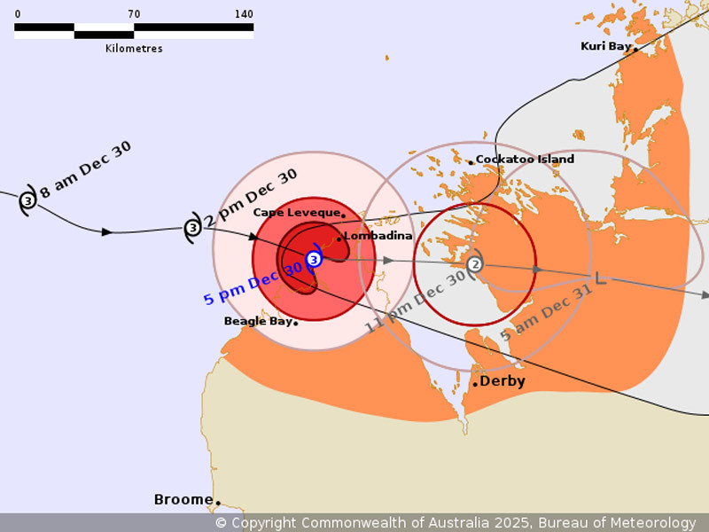 Angin kencang dengan hembusan angin yang merusak hingga 100 km per jam terjadi di Semenanjung Dampier bagian utara, dan diperkirakan akan meluas ke timur hingga Pulau Cockatoo selama malam dan semalaman, dan mungkin di selatan hingga Derby.