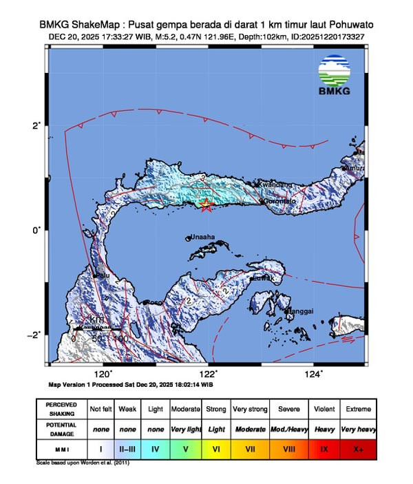 Gempa bumi terjadi pada Sabtu (20/12) pukul 17.33.27 WIB atau 18.33.27 Wita. Berdasarkan informasi dari Badan Meteorologi, Klimatologi, dan Geofisika (BMKG), lokasi pusat gempa bumi terletak pada koordinat 0,47 LU – 121,96 BT. Gempa dengan kedalaman hiposenter 102,0 km.