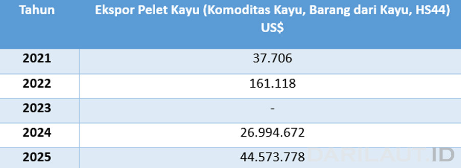 Darilaut – Tahun 2025 volume ekspor pelet kayu (wood pellet) dengan HS Code 44 (komoditi Kayu, Barang dari Kayu) asal Provinsi Gorontalo meningkat menjadi 313,9 ribu ton.