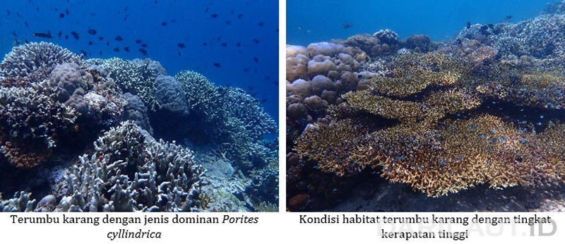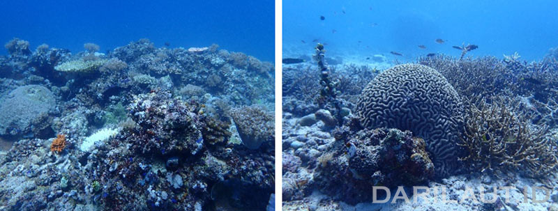Karaktersitik rataan terumbu, lereng terumbu dengan kondisi tutupan karang 50-60% pada kedalaman 5-15 meter. Jenis-jenis karang antara lain: Acropora sp, Pocillopora sp, Platygyra sp, Porites sp, Galaxea sp, Montipora sp, Pleurogyra sp, Pavona sp dan karang lunak yang berasosiasi bambu laut dengan substrat rubble dan berpasir di lokasi Mawasangka (Pulau Muna). FOTO: TIM PENELITI