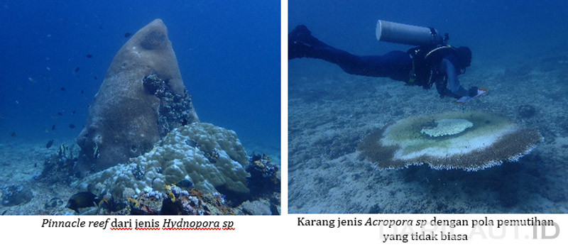Pemutihan karang masal ditengarai akibat dampak dari fenomena ENSO (El-Nino Southern Oscillation) di lokasi Oempu, perairan Bau-Bau, Sulawesi Tenggara. FOTO: TIM PENELITI