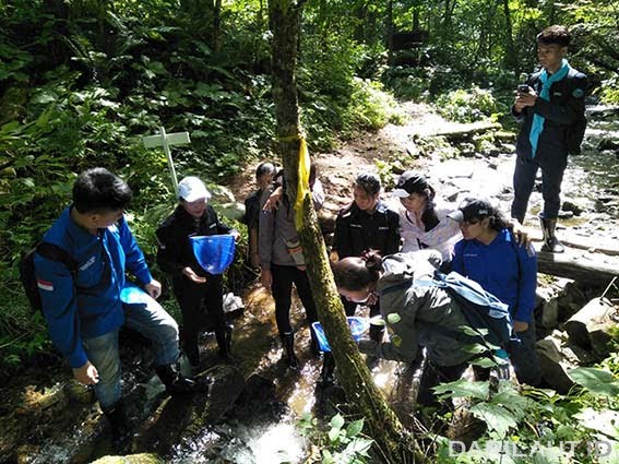 Dengan kegiatan ini, peserta dapat mempelajari bagaimana keberadaan sungai dan integrasi komponen pembentuk di daerah hulu, termasuk ekosistem perairan hulu sungai. Dalam menyusuri tempat bertelurnya ikan salmon, dipandu Profesor Tsuyoshi Sasaki dari Tumsat.